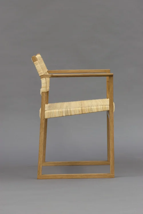 White oak and cane. Bent laminated back legs, double bridle joinery with through mortised tenons. Finished with polyurethane.